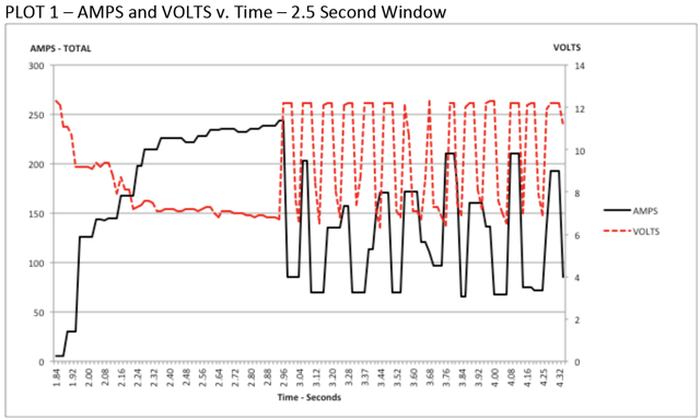 Establish the max “sustained” current draw (with sustained being loosely defined here as not momentary). This is probably the most difficult part of creating the power budget. The exact current draw a battery can sustain while maintaining a voltage of 7+ volts is dependent on a variety of factors such as battery health and state of charge. As shown in the NP18-12 data sheet, the terminal voltage chart gets very steep as state of charge decreases, especially as current draw increases. This datasheet shows that at 3CA continuous load (54A) a brand new battery can be continuously run for over 6 minutes while maintaining a terminal voltage of over 7V. As shown in the image above (used with permission from Team 234s Drive System Testing document), even with a fresh battery, drawing 240A for more than a second or two is likely to cause an issue. This gives us some bounds on setting our sustained current draw. For the purposes of this exercise, we’ll set our limit at 180A.