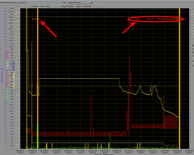 The easiest way to identify a brownout is by clicking on the CAN\Power tab of the DS and checking the 12V fault count. Alternately, you can review the Driver Station Log after the fact using the Driver Station Log Viewer. The log will identify brownouts with a bright orange line, such as in the image above (note that these brownouts were induced with a benchtop supply and may not reflect the duration and behavior of brownouts on a typical FRC robot).