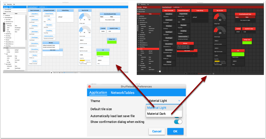 There are a number of settings that set the way Shuffleboard looks and behaves. Those are on the Shuffleboard Preferences pane that can be accessed from the File menu.