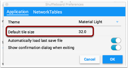 Shuffleboard positions tiles on a grid when you are adding or moving them yourself or when they are auto-populated. You can set the default tile size when for each tab or it can be set globally for all the tabs created after the default setting is changed. Finer resolution in the grid results in finer control over placement of tiles. This can be set in the Shuffleboard Preferences window as shown below.
