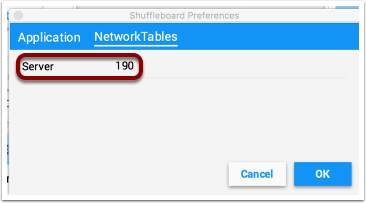 In order for Shuffleboard to be able to find your NetworkTables server on your robot, specify your team number in the “NetworkTables” tab on the Preferences pane. If you’re running Shuffleboard with a running Driver Station, the Server field will be auto-populated with the correct information. If you’re running on a computer without the Driver Station, you can manually enter your team number or the robotRIO network address.