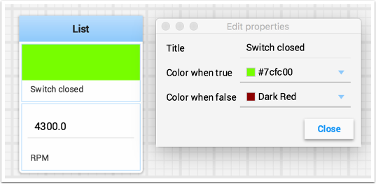 You can change the appearance of a widget such as the range of values represented, colors or some other visual element. In cases where this is possible right-click on the widget and select “Edit properties” from the popup menu. In this boolean value widget shown below, the widget title, true color and false color can all be edited.